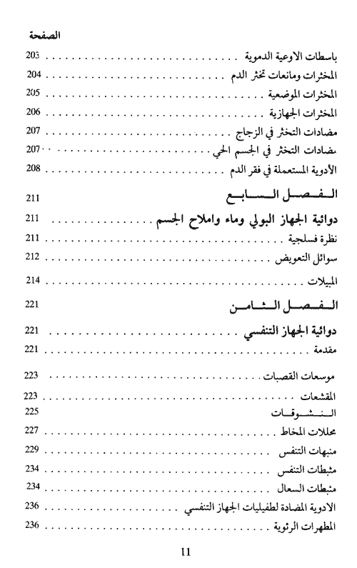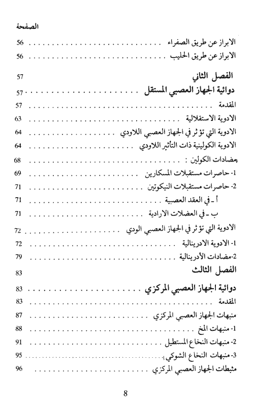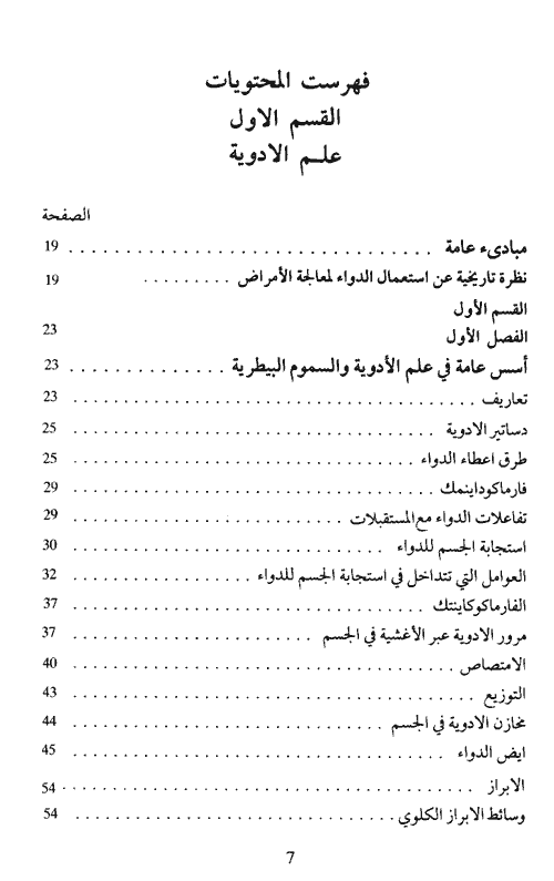 والكتاب بشكل عام انقسم إلى قسمين احتوى الأول على دراسة نظرية تناول علم الأدوية معرفاً بأسسها العامة ودوائية الجهاز العصبي المستقل، ودوائية الجهاز العصبي المركزي، والأوتاكويدات والبروستاكلاندينات... ودوائية الجهاز الهضمي، ودوائية جهاز الدوران والقلب ودوائية الجهاز البولي وماء أملاح الجسم، ودوائية الجهاز التنفسي، ودوائية التكاثر والهرمونات ودوائية زيادة النمو والإنتاج الحيواني والكيموثيرابي أو علاج الأمراض التي تسببها الكائنات الحية بواسطة مواد كيميائية نقية.