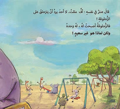 نبذة الناشر:يرفض عنتر السماح لأصدقائه اللعبَ على الزحلوقة، ويستولي عليها ليلعب بها بمفرده، لأنها كما يعتقد ملكه وحده، عندها يتركه الأصدقاء ليتشاركوا ألعاباً أخرى.. قصة لطيفة برسومات طفولية مشوقة، تؤكد متعة العمل الجماعي وأهمية الابتعاد عن الأنانية، وضرورة مشاركة الآخرين.