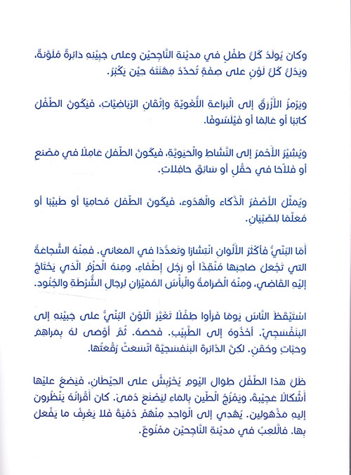نبذة الناشر:فكرة القصة هي موضوع الحرية في التعبير وإحترام قدرات وإهتمامات الأطفال، وفكرة الإختلاف في المجتمعات التي تبدو في البدايات مستهجنة وغير مقبولة، إلى درجة محاربة أصحابها وإتهامهم بالجنون لأنها تخالف الأرشيف المختزن في عقول الناس حول القواعد والقوانين المجتمعية، وهو ما كان في المدينة التي خرج فيها أطفالها عن ما ...هو معد لهم سلفاً من خلال إشارات لونية باتت تظهر على نحو مختلف عما كانت لحظة ولادتهم، ليبدو من خلال الحكاية كم هي السعادة التي يمكن للفنون أو تخلقها في نفوس البشر. إقرأ المزيد