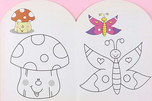 يمكن للطفل اختيار ومزج الألوان باستخدام أمثلة الصور الصغيرة في كل صفحة.