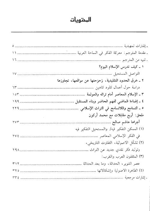 وفيه أيضاً، ينتقد أركون منهجية الاستشراق الكلاسيكي من خلال أحد رموزه الكبرى: المؤرخ كلود كاهين. ويدعو إلى تفكيك الخطاب التقليدي، والخطاب الاستشراقي عن التراث الإسلامي في آن معاً. كما يتحدث أستاذ تاريخ الفكر الإسلامي في السوروبون عن أهم المسائل التي تشغل العرب والمسلمين حالياً: كالأصولية، والعولمة، والتسامح، والصراع مع الغرب، وكيفية تقييم التراث لكي يصبح عامل نهوض، لا عامل كبح أو لجم أو عرقلة أو نكوص...