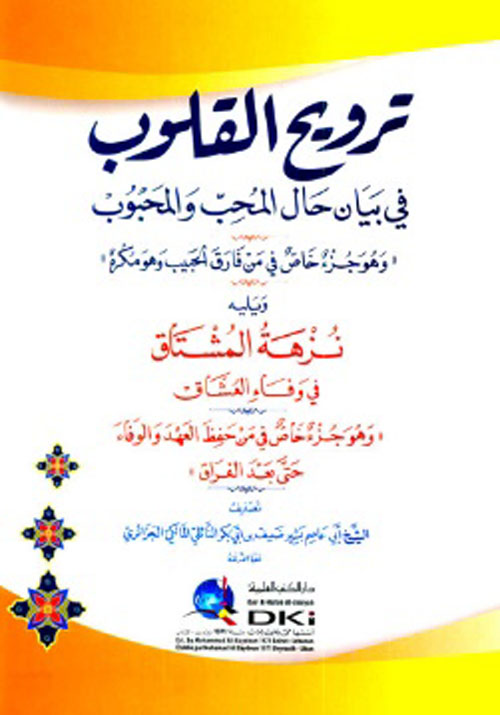 نبذة الناشر:مجموع في الأدب يتألف من كتابين الأول ترويح القلوب في بيان المحب والمحبوب تناول فيه المؤلف المحبين وأحوالهم وقصصهم وقد جمعه من كتب كثيرة والكتاب الأخر هو نزهة المشتاق في وفاء العشاق للمؤلف نفسه تكلم فيه عن الوفاء عند العشاق متمثلً ببعض القصص التي أوفى فيها العاشق لمعشوقه.