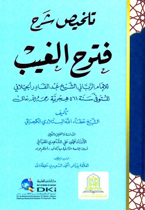 نبذة الناشر:إنَّ الكتابَ الجليلَ الشَّأن المُسَمَّى بـ "فتوح الغيب" المَنسوب إلى المحقِّق العارف الكامل شيخِ السَّالكين، موصلِ الطَّالبين، القُطبِ الرَّبَّانِيَّ، الغوث الصِّمَدَانِيِّ السَّيّد عبد القادر الجيلاني - رضي الله تعالى عنه وأرضاهُ عنَّا - هو كتابٌ عظيمُ المَنفعَةِ، كبيرُ الخطرِ، جليلُ القَدْرِ، سِيَّمَا أنَّ مؤلِّفه هو الزَّاهدُ وشيخُ العصر وقُدوَةُ العارفينَ ...وسلطانُ المشايخ وسيِّد أهلِ الطَّريقة، من حَصَلَ لهُ القَبولَ التَّامُّ، فبظهوره انتصرَ أهلُ السُّنَّة الشَّريفةِ، وانخذلَ أهلُ البدع والأهواء، واشتهرت أحواله وأقواله وكراماته ومُكَاشفاته، وجاءته الفتاوى من سائر الأقطار، وهابَهُ الخلفاء والوزراء والملوك فمَنْ دونهم، فقد كان الشَّيخ عبد القادر متمسِّكاً بقوانين الشَّريعة يدعو إليها وينفِّر عن مخالفتها ويشغل النَّاس فيها، مع تمسُّكِهِ بالعبادة والمجاهدة.