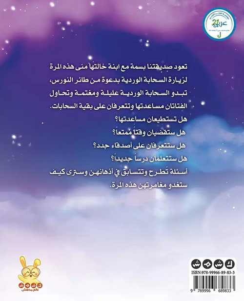 نبذة الناشر:تعود صديقتنا بسمة مع ابنة خالتها منى هذه المرة لزيارة السحابة الوردية بدعوة من طائر النورس، تبدو السحابة الوردية عليلة ومغتمة وتحاول الفتاتان مساعدتها وتتعرفان على بقية السحابات.