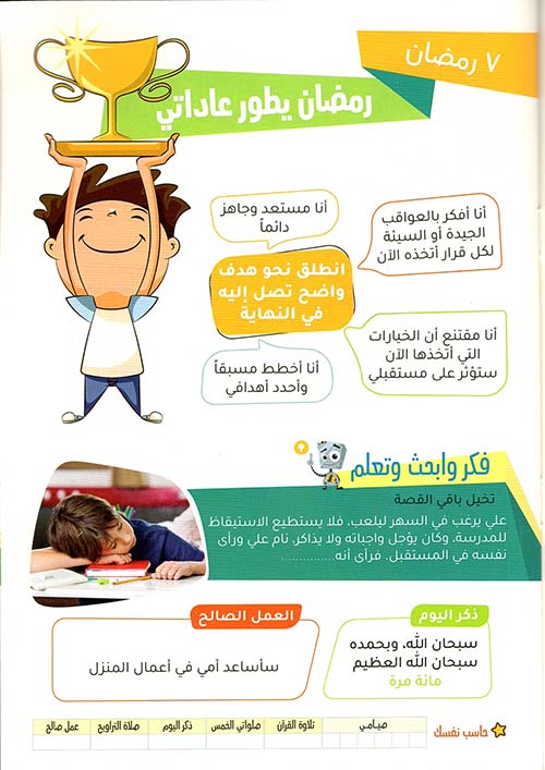 نبذة الناشر:رمضان شهر يصنع المسلم وأطفالنا منه نصيب. كما أنه ينقي الجسد من العلل والأسقام فإنه يبني الشخصية ويصفي الروح. من حق أولادنا علينا أن ندربهم علي حسن الإنتفاع بالشهر الكريم. لنتعاون مع كل أب وأم ومعلم، قمنا بإعداد هذه المفكرة الرمضانية التي تناسب أعمار ما بين 7-12 سنوات.