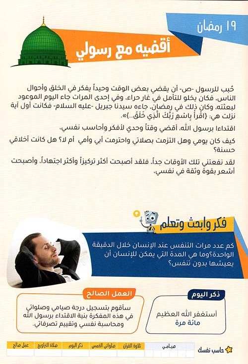 رمضان شهر يصنع المسلم ولأطفالنا منه ...نصيب، كما أنه ينقي الجسد من العلل والأسقام فإنه يبني الشخصية ويصفي الروح، ومن حق أولادنا علينا أن ندربهم على حسن الانتفاع بالشهر الكريم. لنتعاون مع كل أب وأم ومعلم، قمنا بإعداد هذه المفكرة الرمضانية. وبها العديد من الأنشطة التي تناسب أعمار ما بين 7-12 سنوات. إقرأ المزيد
