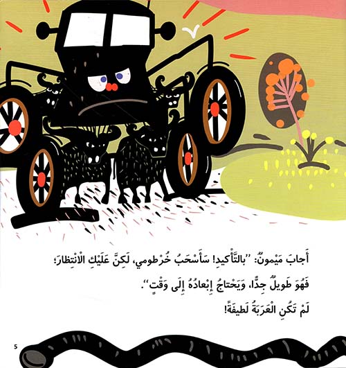 نبذة الناشر:مَيْمونٌ كائِنٌ مُمَيَّزٌ وَغَريبٌ، لَكِنَّ أَكْثَرَ ما يُمَيِّزُهُ هُوَ خُرْطومُهُ الطَّويلُ. في أَحَدِ الْأَيّامِ، يُواجِهُ مَيْمونٌ عَرَبَةً سَوْداءَ غاضِبَةً. وَتَتَحَدَّى الْعَرَبَةُ مَيْمونًا وَخُرْطومَهُ.
