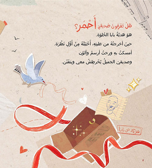 في قصة “صديقي أحمر” يهدي بابا قلمًا أحمر لإيلا وسرعان ما ...تتعلّق به وتجعل منه صديقها المفضل، معه تعبّر عن كل ما يجول في عقلها.. فترسم على الدفاتر، وعلى الجدران، وحتى على حقيبة بابا!