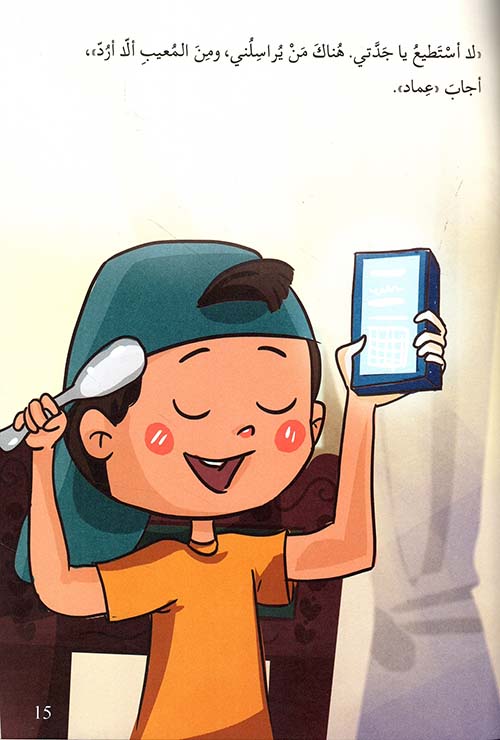 نبذة الناشر:في عُطْلَةِ الرَّبيع، قَرَّرَ «أبو عِماد» بِصُحْبَةِ أبْنائِهِ «عِماد»، «سَمير» و«رُلى» زِيارَةَ أُمِّهِ العَجوزِ في القَرْيَة. في أثْناءِ الرِّحْلَة، بَقِيَ الأطْفالُ الثًّلاثَةُ مُنْشَغِلينَ بِالإنْتِرْنت والعالَمِ الافْتِراضِيّ. وحين وَصَلوا إلى بَيْتِ الجَدَّة، ألْهَتْهُمْ أجْهِزَتُهُمْ عَنْها وعَنْ قِصَصِها الجَميلَة. فَانْزَعَجَتِ الجَدَّةُ كَثيرًا! ولَكِنَّ المَشْهَدَ في النِّهايَةِ تَبَدَّل.