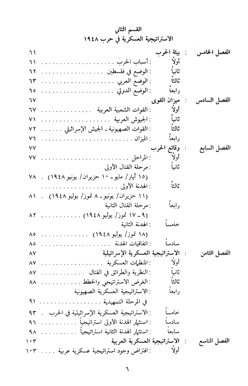 أما الوقائع بتفصيلاتها ومجرياتها فلها مظانها الكثيرة. وفي هذا السياق، يشير الباحث إلى أنه استفاد، في شأن وقائع الحروب، من الدراسة التي أعدها للقسم الثاني المتخصص من الموسوعة الفلسطينية. وحتى يكتمل الإطار الذي توافرت فيه العناصر اللازمة للاستراتيجيات العسكرية أن تتحرك فيه وتعمل وتحقق أهداف خطط العمليات أو تنهزم دونها، تطرقت الدراسة إلى ما هو ضروري من تلك العناصر، مثل بيئة الحرب وميزان القوى وانتشارها. ومن المناسب الإشارة إلى أن حرب 1948 خطيت ببعض التفصيل في المعالجة، ذلك لأنها تكون الحلقة الأولى في سلسلة الحروب الدائرة في إطار الصراع العربي-الإسرائيلي المسلح، ولأنها الوحيدة التي أقرتها جميع البلدان الأعضاء في جامعة الدول العربية يومذاك، ولأنها كانت الأساس الذي بنيت عليه المفاهيم الاستراتيجية لمظاهر الصراع العربي-الإسرائيلي المسلح فيما بعد، وإن بدت تلك المفاهيم وكأنها قد تطورت حتى غدت، ظاهرياً، بعيدة عن المفاهيم الأساسية أو غير ذات صلة بها. خصصت الدراسة جانباً منها لاستراتيجيات المواجهة العسكرية العربية غير النظامية، تناولت فيه تلك الاستراتيجيات في مختلف المراحل التي مر بها الكفاح المسلح الفلسطيني، بدءاً من تكون مفهومه في أثر صدور وعد بلفور حتى انتفاضة الشعب الفلسطيني في أواخر العام 1987. وأخيراً إذ يزعم الباحث أن الدراسة تكاد تكون الأولى في نوعها، من حيث تخصصها بالاستراتيجيات العسكرية العربية للصراع المسلح العربي-الإسرائيلي، فإنه لا يدعى أن الدراسة قد أحاطت بموضوعها من كل جانب، أو أنها جاءت شاملة متكاملة، وهي لا تعدو أن تكون سعياً علمياً هدف لرسم معالم الفكر الاستراتيجي العسكري العربي في مواجهة المشروع الصهيوني في ميدان الصراع المسلح. إقرأ المزيد