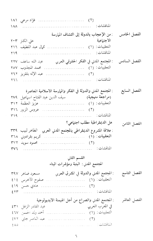 نبذة الناشر:يحتوي هذا الكتاب حصيلة الوقائع الكاملة لبحوث وتعقيبات ومناقشات ندوة المجتمع المدني في الوطن العربي ودوره في تحقيق الديمقراطية، وهي الندوة التي نظمها مركز دراسات الوحدة العربية، وانعقدت في بيروت خلال الفترة 20-23 كانون الثاني/يناير 1992. وقد شارك فيها حوالي المئة من الباحثين والمفكرين والسياسيين العرب، من أنحاء الوطن العربي، ...وممن يمثلون اتجاهات مختلفة، وأجيالاً ثلاثة.