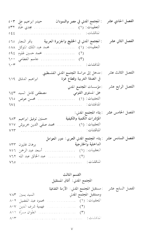 يمثل هذا الكتاب محاولة جادة في تحديد المفاهيم الأساسية، وتوضيح أبعاد مسألة المجتمع المدني في الوطن العربي، كما يعمق الرؤية ويحدد الأهداف في هذا الاتجاه. إقرأ المزيد