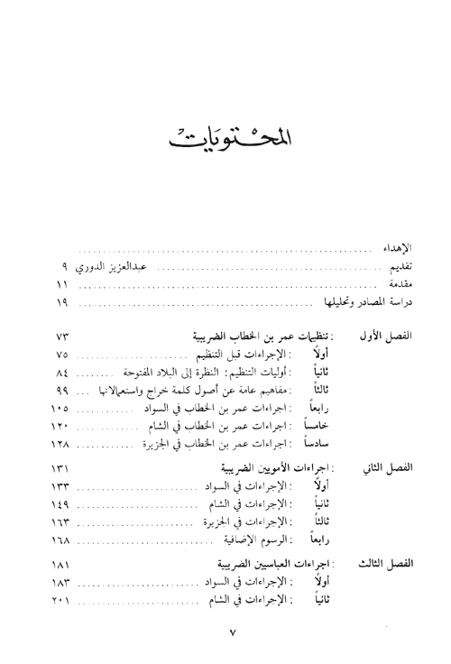 وتناول الجزء الخامس ملكية الأراضي والأحكام الفقهية الخاصة بها. وتوصل البحث إلى نتائج منها: إن الخليفة عمر بن الخطاب استند أساساً إلى المفاهيم الإسلامية في الجزية وألفيء، هذا مع إفادته من التراث الإداري المحلي في بعض التفاصيل الإدارية.