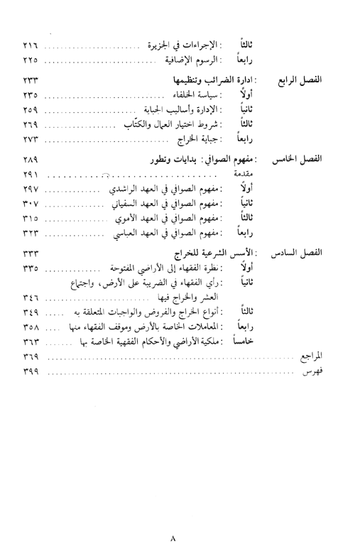 وينتهي الفصل بالإشارة إلى الرسوم الإضافية التي فرضها بعض عمال الخراج على دافعي الضريبة، فاتجه عمر بن عبد العزيز إلى إلغائها رأفة بالناس.