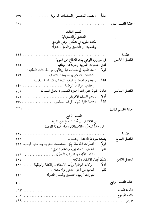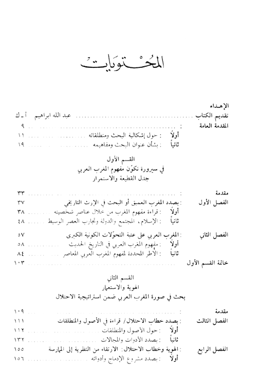 انطلاقاً من هنا فقد تشكلت لدى الباحث أربع قضايا مركزية، متكاملة ومتداخلة، شكلت عصب الأطروحة ومرتكزات بنائها الفكري: 1-كيف تكون مفهوم "المغرب العربي" ليصبح واقعاً تاريخياً-جغرافياً، وحقيقة اجتماعية، سياسية وثقافية؟ (القسم الأول)، 2-كيف تصور الاستعمار الفرنسي "المغاربة"، وضمن أي استراتيجيا تعامل وتفاعل معهم، ولماذا؟ (القسم الثاني)، 3-كيف تمت الاستجابة للتحدي الاستعماري من جانب المغاربة (نخبات وحركات وطنية) ولماذا شكل الدفاع عن "الهوية" أرضيته النضالية، قطرياً وجماعياً، وكيف؟ (القسم الثالث)، 4-لماذا حصل الانتقال من موضوع "الهوية" إلى شعار "الاستقلال"، وكيف تم تأطره من جانب الحركات الوطنية المغربية، والتفاعل معه من طرف الاستعمار الفرنسي؟ (القسم الرابع).
