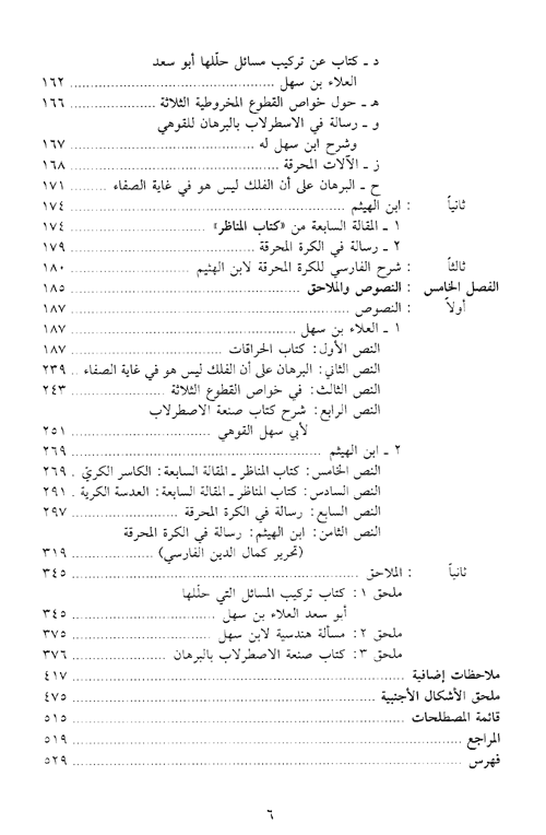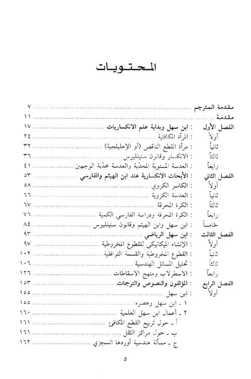 نبذة نيل وفرات:يتألف هذا الكتاب من أقسام ثلاثة، خصصت كالتالي: أولها لتدوين تاريخ علم الانكساريات العربي وابن سهل الرياضي، والثاني للنصوص المثبتة (مرفقة بترجمة لها)، أما الثالث فللملاحظات المكملة الضرورية لاستيعاب النص وللفهارس. وقد انطلق الدكتور رشدي راشد في دراسته هذه من الروابط الوثيقة ما بين البحث الهندسي من جهة والبحث ...البصري والفلكي من جهة أخرى تلك التي بينتها دراسات ابن سهل والفوهي من خلال انكبابهما على دراسة إسقاطية الكرة.