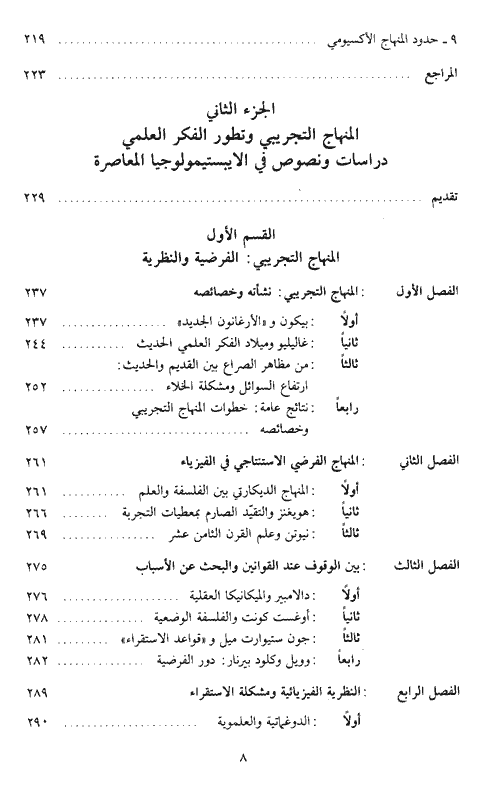 واشتمل الكتاب على جزأين: عالج المؤلف في الجزء الأول منه مفهوم الايبستيمولوجيا وعلاقتها بالدراسات المعرفية الأخرى، القديمة والحديثة، متبعاً نظرة الفلاسفة والعلماء إلى مشكلة المعرفة، مركزاً على الاتجاهات المعاصرة، سالكاً المنهج التاريخي النقدي. أما الجزء الثاني فقد خصصه للمنهاج التجريبي وتطور الفكر العلمي في ميدان الفيزياء، منذ بيكون وغاليلو إلى الفيزياء الذرية، مركزاً على الجانب المعرفي، غير مغفلاً الإشارة إلى بعض الكشوف العلمية التي تلقي الضوء على القضايا الايبستيمولوجية المطروحة وتجعل القارئ غير المختص يدرك منابعها وإطارها العلمي والتاريخي.