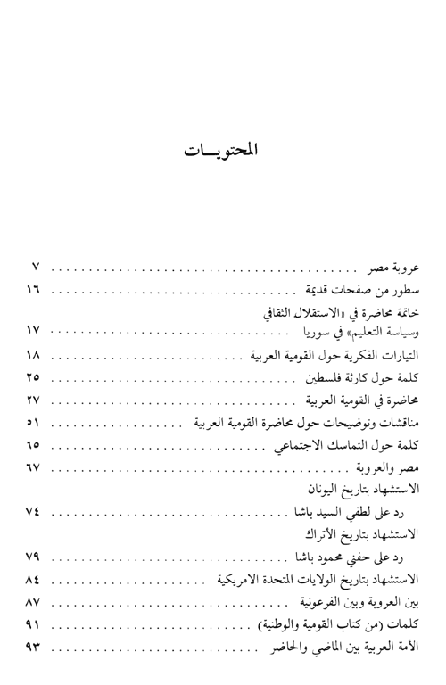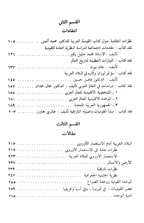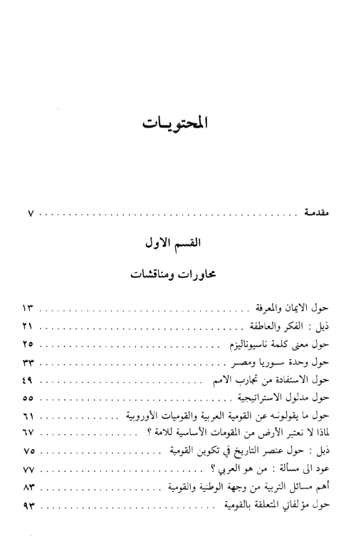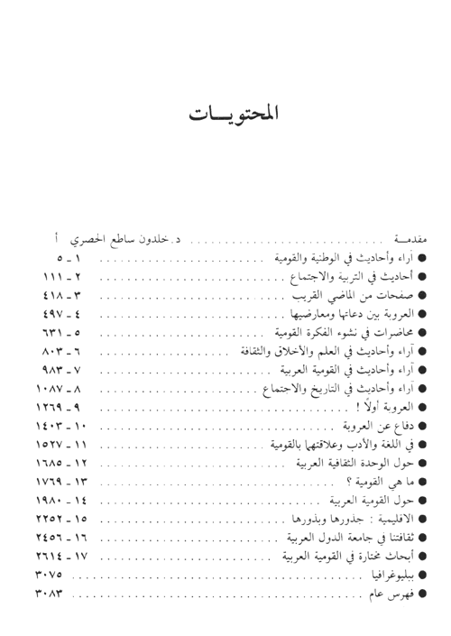 إن "الأعمال القومية" التي هي بين يدي القارئ، تحتوي على الكثير من هذه الكتابات في التربية والاجتماع، مما ليس له علاقة مباشرة بموضوع القومية. هذا وبالإمكان إلقاء الضوء على تلك الأعمال القومية لساطع الحصري والتي ضمّها هذا الكتاب وهي: آراء وأحاديث في الوطنية والقومية، أحاديث في التربية والاجتماع، صفحات من الماضي القريب، العروبية بين دعاتها ومعارضيها، محاضرات في نشوء الفكرة القومية، آراء وأحاديث في العلم والأخلاق والثقافة، آراء وأحاديث في القومية العربية، آراء وأحاديث في التاريخ والاجتماع، العروبة أولاً، دفاع عن العروبة، في اللغة والأدب وعلاقتهما بالقومية حول الوحدة الثقافية العربية، ما هي القومية، حول القومية العربية، الإقليمية جذورها وبذورها، ثقافتنا في جامعة الدول العربية، أبحاث مختارة في القومية العربية. إقرأ المزيد