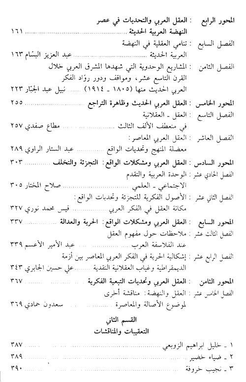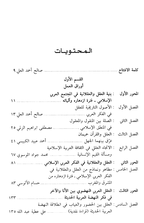 وقد ترتبت تلك الآراء والأفكار ضمن محاور ثمانية. دار المحور الأول نية العقل والعقلانية في المجتمع العربي الإسلامي فترة ازدهار وآلياته، وتناول المحور الثاني موضوع العقلانية والعقلانية في الفكر العربي الإسلامي، ودار النقاش في المحور الثالث حول العقل العربي النهضوي بين الأنا والآخر في فكر النهضة العربية الحديثة، وأما المحرر الرابع فقد تحدث عن العقل العربي والتحديات في عصر النهضة العربية الحديثة، وتناول المحور الخامس العقل العربي الحديث وظاهرة التراجع. وكان المحور السادس محل بحث العقل العربي ومشكلات الواقع: التجزئة والتخلف، وطرح المحور السابع موضوع العقل العربي ومشكلات الواقع: الحرية والعدالة، وتم النقاش في المحور الثامن في مسألة العقل العربي وتحديات التبعية الفكرية. وبهذا يمكن القول أن هذه الندوة بمحاورها استعرضت مسيرة العقل العربي، منذ ما قبل الإسلام، ثم خلال العصور اللاحقة حتى الحقبة الراهنة، للتأكيد على التلازم الحتمي بين العقل والإيمان، وهو تلازم يأخذ بيد الأمة العربية إلى مصاف التقدم في كافة مجالات الحياة، والعبرة من التاريخ.نبذة الناشر:يستعرض الكتاب مسيرة العقل العربي منذ ما قبل الإسلام، ثم خلال العصور اللاحقة حتى الحقبة الراهنة، ويعالج مسألة العقلانية في الفكر العربي-الإسلامي. وهو إذ يرفض مقولة التضاد بين العقل والإيمان، يرفض كذلك مقولة أن العقل الديني قد حدَّ من حرية البحث العلمي.