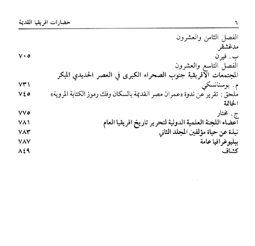 ويتناول هذا المجلد من "التاريخ العام لإفريقيا" تلك الحقبة الطويلة من تاريخ القارة التي تمتد من نهاية العصر الحجري الحديث، أي منذ نحو ثمانية آلاف سنة قبل الميلاد، إلى بداية القرن السابع الميلادي. وهذه الحقبة تستغرق حوالى تسعة آلاف سنة من تاريخ إفريقيا، جرى تقسيمها إلى أربعة مناطق جغرافية رئيسية: وادي النيل-مصر والنوبة (من الفصل الأول إلى الثاني عشر)، المرتفعات الأثيوبية (من الفصل الثالث إلى الفصل السادس عشر)، الجزء من إفريقيا الذي أطلق عليه غالباً فيما بعد اسم المغرب وما يتصل به من مناطق صحراوية من الداخل (من الفصل السابع عشر إلى الفصل العشرين)، بقية إفريقيا بالإضافة إلى الجزر إفريقية في المحيط الهندي (من الفصل الحادي والعشرين إلى الفصل التاسع والعشرين). هذا وقد وزعت المواضيع في 800 صفحة من النصوص متضمنة عدداً من اللوحات والصور الفوتوغرافية والخرائط والرسوم الخطية. إقرأ المزيد