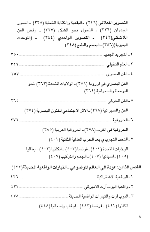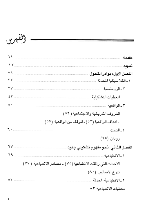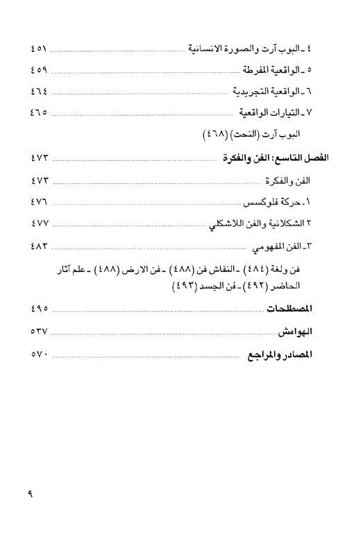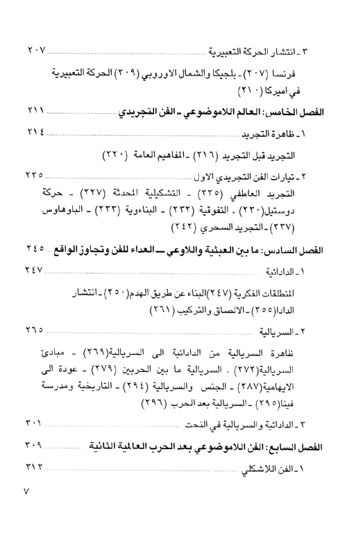 وإذ يتناول الكتاب مختلف المدارس والتيارات الفنية المعاصرة-من الواقعية الانطباعية والرمزية، إلى التعبيرية والتكعيبية والسريالية، فالتجريد والفن المهفومي-إنما يتوافق عند عوامل نشأتها ومراحل تطورها وما تعرضت له من أزمات هي وليدة هذا الواقع المتغير. فبعد أن كان الفن قد تحرر في العصور الحديثة، من وظيفته الإخبارية، التسجيلية، بات لا نفع له، بالمعنى المادي (الوظيفي) للكلمة، وانزوى بشكل متصاعد داخل حدود هذه الصفة اللانفعية. ولكن مع ذلك، فالعمل الفني لم يتخل عن دوره الاتصالي الاجتماعي، وما زال يقوم بهذا الدور على الرغم من اتساع نطاق استخدام الكمبيوتر وما له من أثر مباشر على طبيعة الإنتاج الفني.