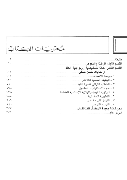 تناول الباحث ذلك ضمن قسمي هذا الكتاب: القسم الأول الرضة والنكوص، القسم الثاني: حالة تشخيصية، ازدواجية العقل في كتابات حسن حنفي، وحدة الأضداد، الوظيفة النفسية للتناقض، الخطاب التراثي كسيرة ذاتية، علم "الاستغراب" المركزية الغربية والمركزية الإسلامية المضادة، التطهرية الحضارية، التراث كأب مضطهد، الترميم النرجسي.نبذة الناشر:في هذا الكتاب، وهو الأول في موضوعه وفي منهجيته بالعربية، يمدد جورج طرابيشي على سرير التحليل النفسي الخطاب العربي المعاصر الذي بدأ ينتج نفسه ويعيد إنتاجها بآلية تكرارية منذ الرضة الحزيرانية عام 1967، ويخضعه لحفريات سيكولوجية تكشف عن بنيته التحتية ومعيناته اللاشعورية تحت مجهر ما يسميه المؤلف بـ"عصاب جماعي عربي" وهو العصاب النكوصي الذي يتمظهر من خلال خطاب التراث كما تمارسه شريحة واسعة من الانتلجنسيا العربية.