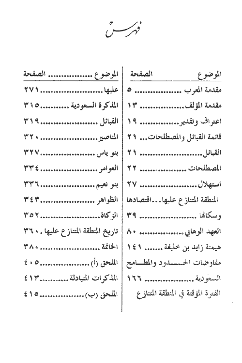 ويمضي الناقد فيقول... ويعرض الدكتور كيلي مؤلف الكتاب في النصف الأول منه تاريخ التوسع السعودي في الجزء الشرقي من شبه الجزيرة العربية في غضون المائة والخمسين سنة الماضية، وسير المفاوضات المتعددة لتقرير الحدود. أما في النصف الثاني من الكتاب فالمؤلف يعالج الأحداث التي وقعت بعد الحرب العالمية الثانية ويعرض المطالب الإقليمية الواسعة التي تقدمت بها العربية السعودية في عام 1949، والاحتلال السعودي لواحة بين عامي 1952، 1955، والمحاولات التي جرت لتسوية قضية الحدود عن طريق التحكيم وأسباب فشله. وهو يدرس الحجج السعودية التي تقدمت بها لدعم مطالبها الإقليمية ويناقشها بتفصيل واف، ويؤيد المطالب المضادة لأمراء الخليج ويؤكدها بمناقشات منطقية. وهو يستند في القسم الغالب من كتابه إلى بحوث أصيلة قام بها في السجلات التاريخية ذات العلاقة، وكذلك على المواد والمعلومات التي جمعها من المنطقة أثناء طوافه بها. إقرأ المزيد