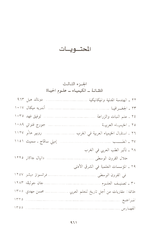 وقد اشتملت على ثلاثة كتب: الأول في علم الفلك النظري والتطبيقي: الهيئة، آلات الأظلال والميقات، الجغرافيا الرياضية، علوم البحار. الكتاب الثاني في الراضيات والعلوم الفيزيائية: الرياضيات العدوية، الجبر الهندسة، المثلثات، الرياضيات التحليلية، الموسيقى، الستاتيكا، المناظر والبصريات. الكتاب الثالث في التقانة والكيمياء وعلم الحياة: الهندسة المدنية والميكانيكا، الجغرافيا الإنسانية، الفلاحة، الكيمياء، الطب. إقرأ المزيد