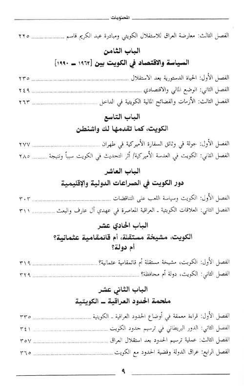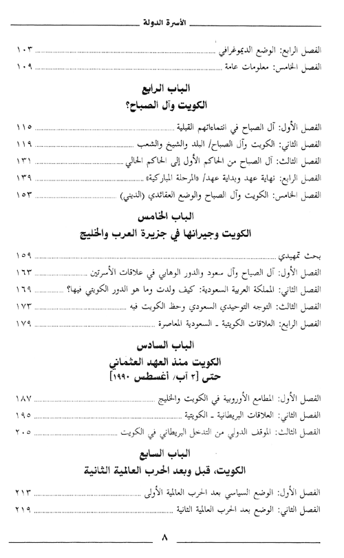 وكان للكتاب وقفة هامة أمام تاريخ العلاقات الكويتية السعودية لا سيما في المراحل الأولى من قيام الحركة الوهابية في نجد الشيء المهم أيضاً في هذا الكتاب هو التي حول تاريخ الأسرة الحاكمة في الكويت "آل الصباح" وهي الأسرة المؤسسة التي كانت وراء ولادة هذه الأنماط من الدويلات الخليجية، ذات البنية الهشة، و الهيكلية القبلية. كما ويهتم الكتاب بإبراز طبيعة الحكم في دولة الكويت وأشكال النظام السياسي وتطوره ومحاولات الشعب فرض نوع من الحياة الدستورية البرلمانية ومراحلها وانتهت إليه مؤخراً.