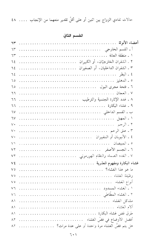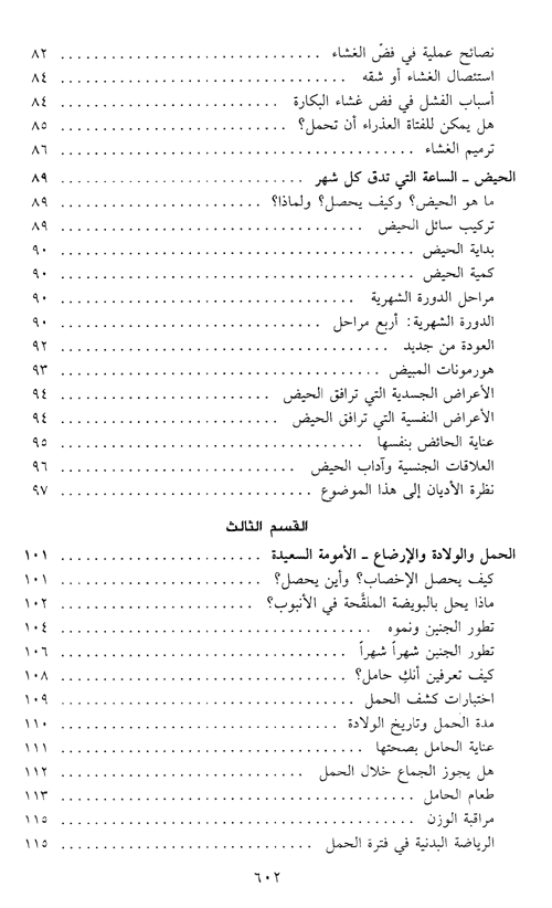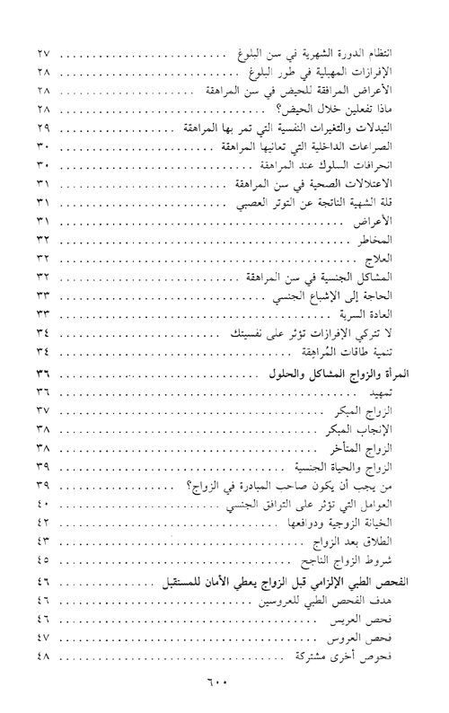 ضمن الكتاب، علاوة على وصف دقيق للأمراض النسائية وأسبابها وكيفية معالجتها، مقاطع تثقيفية عن وسائل التشخيص المبكر والوقاية منها وتفاديها، من بينها: الأمراض الزهرية والتناسلية، والالتهابات، والأورام، وسرطان الرحم والثدي، والأوجاع المبرحة التي تقض مضاجعها. وفي الكتاب أيضاً فصل عن معالجة العقم وكيفية إجراء التلقيح الاصطناعي بالتقنيات الحديثة وعرض لأهم موضوع يهم المرأة المعاصرة ألا وهو انقطاع الحيض، والمعالجة بالهرمونات البديلة، وكيفية معالجة ترقق العظم، وكل ما يمكن أن تتعرض له المرأة في حياتها. إقرأ المزيد