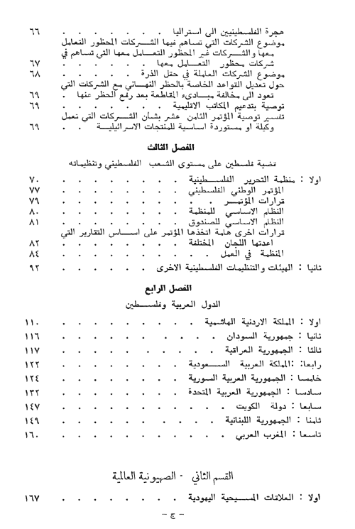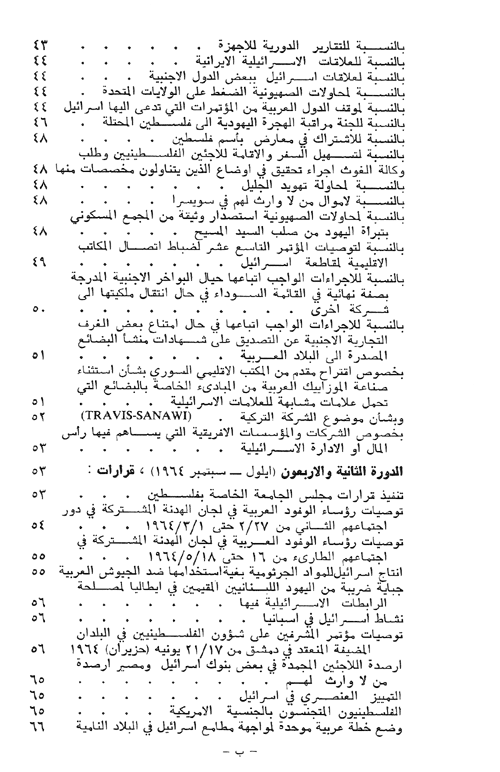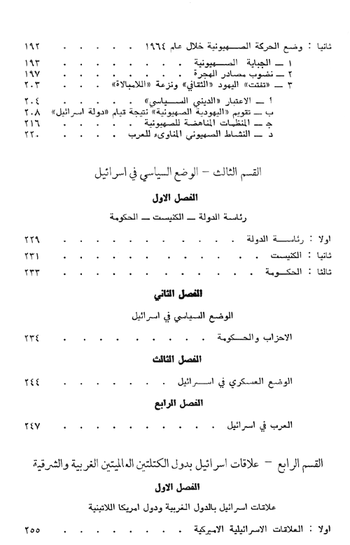 أما المجالات التي يتناولها الكتاب، فهي المجال العربي، على أصعدته المختلفة: ومؤتمرات القمة والأجهزة المتفرعة عنها، والجامعة العربية وأجهزتها، والدول العربية المختلفة، وصعيد الشعب الفلسطيني نفسه. ثم الصهيونية العالمية، ونشاطاتها المنوعة في مختلف أنحاء العالم لدعم إسرائيل وتزويدها بالمال، والسلاح والعون السياسي، مختلف أنحاء العالم لدعم إسرائيل، وتزويدها بالمال، والسلاح، والعون السياسي، والقدرة على التحرك متى حالت الفرصة، ثم إسرائيل نفسها وما يجري فيها من تطورات في شتى الميادين السياسية والاقتصادية، وما يحدث من تفاعل بين القوى المختلفة التي تتألف منها، وما يحدث من تفاعل بينها وبين الصهيونية العالمية نفسها.