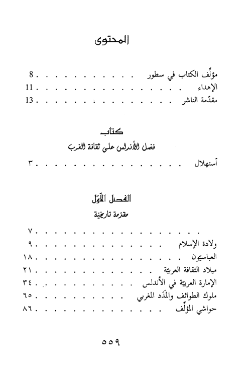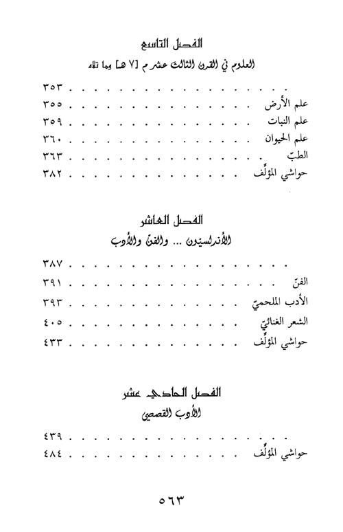 وقد قسم المؤلف أزمان انتقال العلوم العربية حسب القرون الميلادية، ورصدها رصداً أوفى على الغاية. ولم يشأ أن يخلي كتابه من حديث مستطرد عن الأدب، فكتب عما أبدعه الأندلسيون في مجال الأدب والفن، وخص الأدب القصصي بالفصل الأخير.