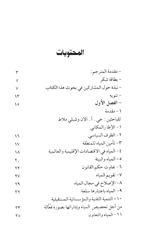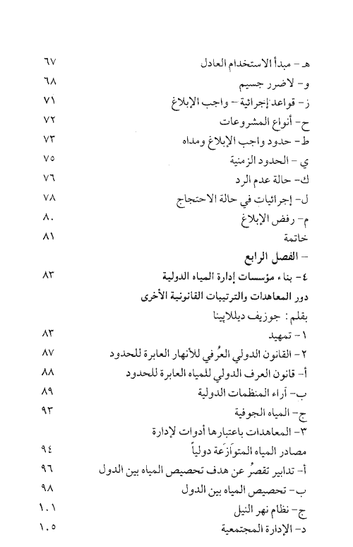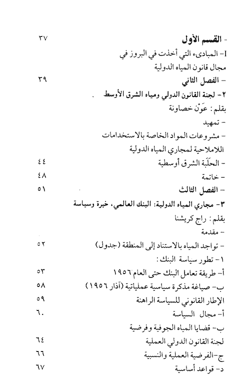 يقع الكتاب في ستة أقسام، القسم الأول يعرض للمبادئ التي أخذت في البروز في مجال قانون المياه الدولية حيث يعرض هذا الباب لمشروعات المواد الخاصة بالاستخدامات اللاملاحية لمجاري المياه الدولية وللجنة القانون الدولي ومياه الشرق الأوسط. كما يتناول الباب بالبحث موضوع مجاري المياه الدولية وللدور الحاسم الذي يؤديه البنك العالمي في تنمية مصادر المياه والانتفاع بها في الشرق الأوسط وفي جميع أرجاء العالم ويتطرق أيضاً إلى الاتفاقيات الثنائية الدولية أو الاتفاقيات الدولية المتعددة الأطراف المتعلقة بإدارة المياه.