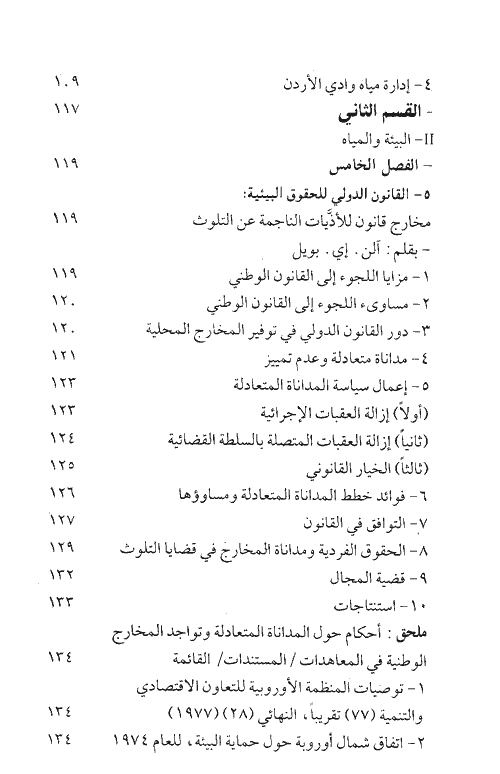 أما القسم الثاني فهو يدور حول البيئة والمياه ويبحث في القانون الدولي للحقوق البيئية وقانون المياه في اقتصاد الطبيعة. ويبحث القسم الثالث في الأعراف المحلية، والبحث عن مبادئ استخدام المياه، والقانون الناظم للمشروعات المائية والتشريعات المائية في لبنان. أما القسم الرابع فهو دراسات تتناول قيود وفرص للتعاون على نطاق حوض النيل الشامل من منظور قانوني وتركيا ومياه الفرات والقانون الدولي العام.
