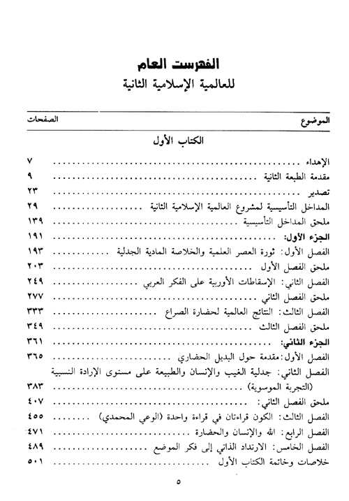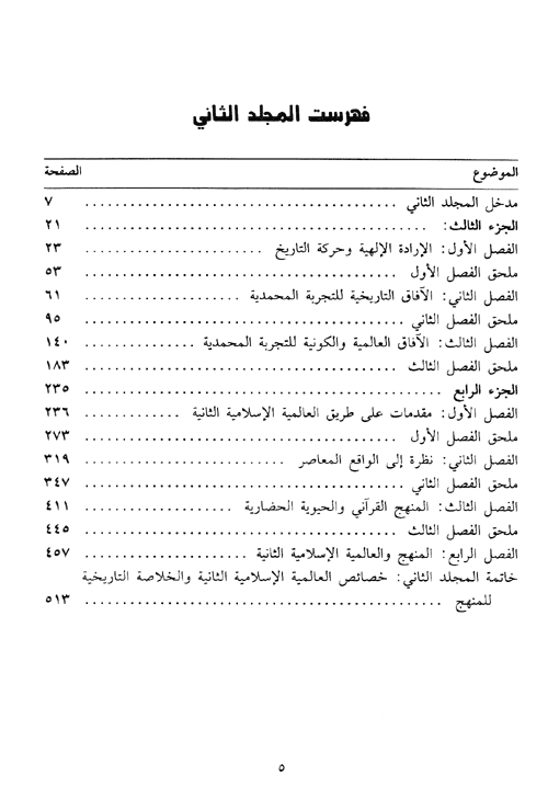 كذلك كانت للكتاب مقدمة في طبعته الأولى تمثل إلى حدّ ما لواعج المؤلف ومشاعره خلال الظروف التي سبقت وواكبت وأظلّت المنطقة في إطار سقوط عرش الشاه في تلك المرحلة، ثم تناول في الجزء الأول من الكتاب (الخصائص الفكرية للحضارة العالمية الغربية الراهنة)، فجاء بتحليل دقيق لمحددات ومقدمات وخصائص تلك الحضارة بشكل مجمل، مبنياً في هذا الجزء كيف هرب الغرب نحو البراغماتية، فأعطى جملة من المؤشرات الهامة حول النتائج التي لم تصب الغرب وحده بل أصابت العالم كله نتيجة لتلك الحضارة الصراعية ذات الثنائيات المتقابلة وذات الطبيعة التنابذية وفي مقدمتها حتمية سقوط التجربة السوفياتية التي أشار إليها منذ عام 1979 والإفلاس الذي يواجه الغرب نتيجة البراغماتية واللبرالية فلا يبقى غير الإسلام. ثم تحول في الجزء الثاني أو القسم الثاني من الكتاب، ليقدم البديل الحضاري من خلال (جدلية الغيب والإنسان والطبيعة) هذا البديل الحضاري الذي لم يكن أي شيء، سوى الإسلام المستقبلي المؤسس على منهجية القرآن المعرفية. ثم ينتقل إلى الجزء الثالث والذي اختار له عنوان (الله والتاريخ) متناولاً ما أراد أن يدرجه من موضوعات في دائرة هذا الجزء تحت العناوين التالية: الإرادة الإلهية وحركة التاريخ، آفاق التجربة المحددية، البعد التاريخي للرسالة المحمدية، الفارق بين التجربتين العربية والإسرائيلية، العرب والتحول القرآني. ثم يقدم لنا الجزء الرابع الذي يتحدث فيه عن (اتجاه) العالمية الإسلامية الثانية فيضع لنا مقدمات على طريق العالمية الثانية، ثم العرب على طريق العالمية الثانية، ثم نظرة تحليلية للواقع المعاصر، ثم يأتي للبديل الحضاري، فالمنهج القرآني والحيوية الحضارية، فالمنهج والعالمية الثانية، خصائص العالمية الإسلامية الثانية، والخلاصة التاريخية للمنهج، والقرآن والمتغيرات.