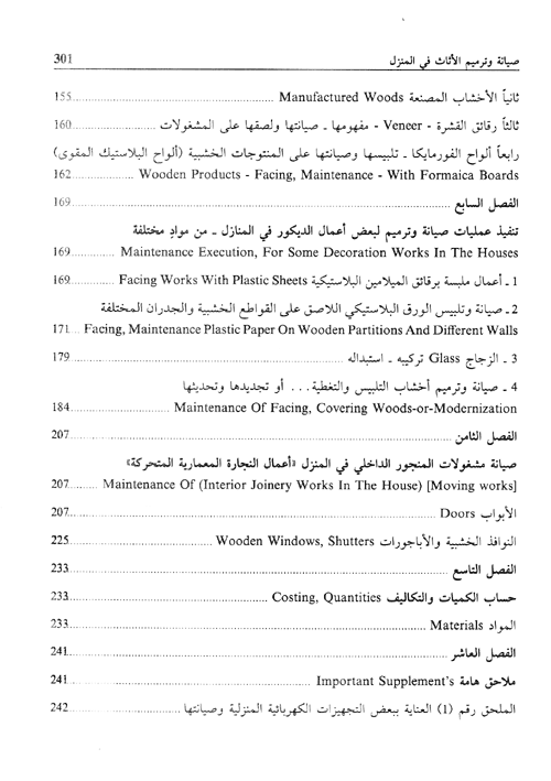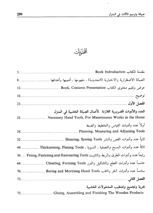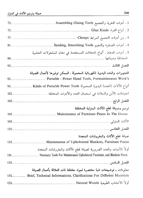 نبذة نيل وفرات:تعتبر صيانة القطع والمشغولات الخشبية-المنزلية، وإصلاح الأجزاء المتألفة فيها بمختلف أنواعها من الأمور الهامة والضرورية-القيام بها، وبغية المحافظة عليها وإبقائها جيدة وسليمة لكي تفي بوظائفها وأغراضها التي صنعت من أجلها وإطالة مدة استخدامها والمحافظة على مظهرها سواء أكانت الصيانة في أجزائها أو تركيبها ووصلاتها أو في تشطيبها وكسوتها... إلخ. ...ويعد الأثاث من أهم المشغولات الخشبية المنزلية الذي تجري عليه أعمال مختلفة من الصيانة والترميم سواء كان منجداً أو غير منجد حسب استعماله ووظائفه، ثم يلي ذلك أعمال المنجور المختلفة كالمشغولات المتحركة، أو الثابتة... إن أعمال الصيانة المنزلية-الخشبية-غالباً ما تكون في ترميم وإصلاح أعطاب وإتلافات طارئة في الأخشاب كالتعفن الذي ينتج من تعرضها للرطوبة لمدة طويلة أو سوء تهويتها-الأمر الذي يسبب تشققها أو بروز أليافها مما يؤثر على مظهرها ولونها وخاصة في بعض قطع الأثاث وأعمال المنجور الخارجية وغيرها. كذلك التلف الناتج عن سوء استخدامها وسحبها على الأرض مما يؤدي إلى خدش سطحها وتفكك وصلاتها، كذلك الأمر في ارتخاء أو تلف بعض خردواتها (متمماتها) المختلفة كمفصلاتها أو أقفالها... ولكل من هذه الأعطاب والإتلافات طرق وأساليب معينة في ترميمها وصيانتها وإعادتها إلى حالتها التي يجب أن تكون عليها من القوة والمتانة والمظهر المناسب... وفي هذا الكتاب قام المؤلف بتوضيح الطرق والأساليب المستخدمة في صيانة وترميم الأثاث في المنزل، مستخدماً حداثة المعلومات وربط المفاهيم النظرية والعملية معاً-والتعرض لحسابات الكميات والتكاليف الخاصة بأعمال الصيانة المتنوعة، إضافة إلى وضع الرسومات التفصيلية والتوضيحية لكافة الجوانب الفنية بهدف السهولة في فهمها واستيعابها وتطبيقها بالطرق الأدائية السليمة بالتصميمات والأشكال الحديثة والمناسبة هذا وقد قسم المؤلف كتابه إلى عشرة فصول، تناول فيها أسس ومبررات الصيانة في المنزل وأنواعها والتي تشمل على كافة المشغولات الخشبية بداخله كالأثاث بأنواعه وأشغال المنجور والديكور المختلفة. كما وتناول فيها الطرق والأساليب الصحيحة والمأمونة والاقتصادية أيضاً-في إجراء هذه الصيانة حسب نوعها وحجمها، إضافة إلى المواد والمقتنيات الغير خشبية الأخرى التابعة لها "الأمر الذي يستدعي صيانتها أيضاً". إقرأ المزيد