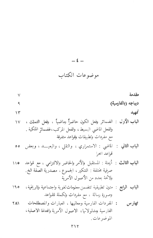 التي تمتد ثلاث عشرة سنة في تعليم اللغة الفارسية في الجامعتين اللبنانية والأمريكية في بيروت، وهدفه منه أن ييسر على القارئ العربي تعلم هذه اللغة التي مازجت لغته طوال قرون، فلي ميدان الأدب والفكر والمفردات المتبادلة، مزاجاً وتراحماً حميماً جعل درس ...كل من اللغتين ضرورياً لفهم الكثير من المفردات والتراكيب في اللغة الأخرى، وللوقوف على المتون الأدبية والتاريخية والفلسفية التي تتناول ثقافتهما المشتركة العريقة.