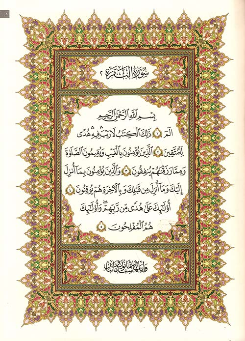 تضم هذه النسخة من المصحف الشريف سور القرآن كاملة ضمن كتاب واحد، ملحق بدعاء ختم القرآن، وبيان لعلامات الوقف ومصطلحات الضبط. وغلاف مزين بزخارف ذات خطوط ذهبية وملونين، وصفحات بنهايات مذهبة الأطراف محفوظة ضمن علبة تعلوها الزخارف المذهبة، وبحجم من القطع الكبير.