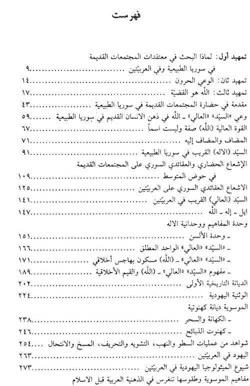 نبذة نيل وفرات:لعل الجانب المهم الذي ظل مغفلاً أو مهملاً في دراسات الباحثين والمؤرخين، هو شيوع المثيولوجيا اليهودية في العربيتين، وتم مجيء محمد صلى الله عليه وسلم الذي اقتلع في زمن قصير ما انغرس في الذهنية العربية في القرون الستة الأولى بعد المسيح، من مفاهيم يهودية وطقوس كهنوتية، كان من الممكن، ...لولا دعوة محمد صلى الله عليه وسلم، أن تتجذر في الذهن العربي، فيسود التهود، وبالتالي تسود اليهودية في الأرض العربية. وإيماناً من جورجي كنعان بضرورة إجلاء الحقائق وتنقيتها من الشوائب كان بحثه في هذا الكتاب الذي تناول فيه حضارة المجتمعات القديمة في سوريا الطبيعية وفي العربيتين لينتقل إلى وحدة المفاهيم ووحدانية الإله ليعرض أخيراً، ومن باب الإشارة، نماذج من أغلاط المؤرخين الغربيين الذين قصروا في الوقوف على أسرار الضادية ولطائفها، واستجلاء مزاياها وخفاياها لذا جاء خلطهم بين مفهوم المعتقدات الطبيعية وبين مفهوم الديانات التاريخية أو الوضعية. من هذا المنطلق كانت محاولة الكاتب في بحثه هذا لإنارة جوانب من أخطر مسألة دينية فكرية اجتماعية، وسياسية تواجه العالم، وهي: كيف، ولماذا نسيت أو تناست أقوام نصف الكرة الغربي مفهوم "العالي" (عل-إيل-إله-الله) الذي ساد في العالم القديم، وأخذ به سيد المسيحية-يسوع الناصري، وراحت تعبد في محراب يهوه الموسوي-رب بني إسرائيل القومي العنصري؟ إقرأ المزيد
