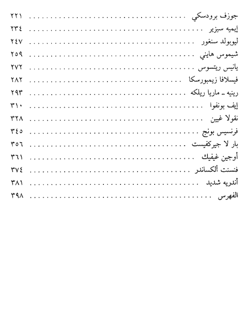 من هؤلاء: تريستان تزارا، بوريس باسترناك، لويس أراغون، فيديريكو غارسيا لوركا، شيسلاف ميلوش، بول فاليري.. ت س اليوت، بابلو نيرودا، أوكتافيو باث، جان كوكتو، غيوم أبو لينير... ايميه سيزير، ليوبولد سنفور... أندريه شديد وغيرهم. إقرأ المزيد