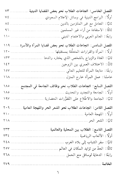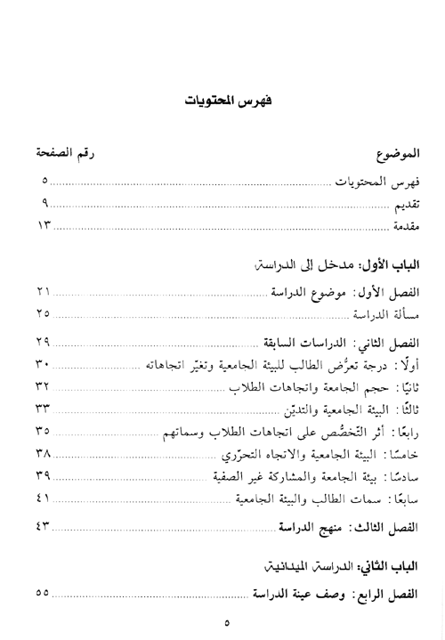 ويستطيع القارئ ومن خلال ما توصل إليه المؤلف أن يتعرف على ما هو تأثير الحياة الجامعية على اتجاهات الطلبة بصفة عامة وعلى اتجاهاتهم نحو هذه القضايا بصفة خاصة، ويستطيع القارئ من خلال ذلك أيضاً، أن يستنتج ما إذا كانت هذه التأثيرات تنسجم مع التوجهات السائدة في المجتمع.