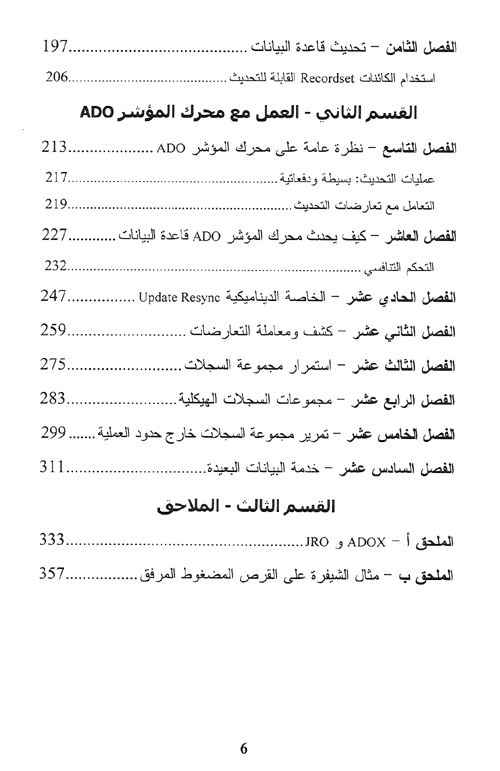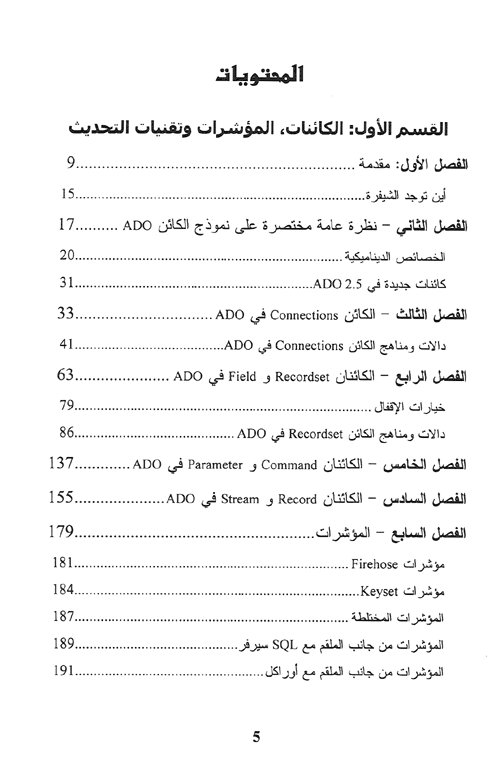 في البداية، يقودك المؤلف عبر نموذج الكائن-ADO مشاركاً إياك خبرته كمحترف دعم فني في مايكروسفت، في كل من الخصائص، المناهج والأحداث التي تشكل تحدياً لمبرمج ADO. سوف تتعلم كيف تستخدم محرك المؤشر ADO لكي تسهل التطوير-ولكي تتعلم كيف تعمل مع محدداته بفعالية. بعد ذلك سوف تركز على بناء البراعة مع تقنيات برمجة ADO.