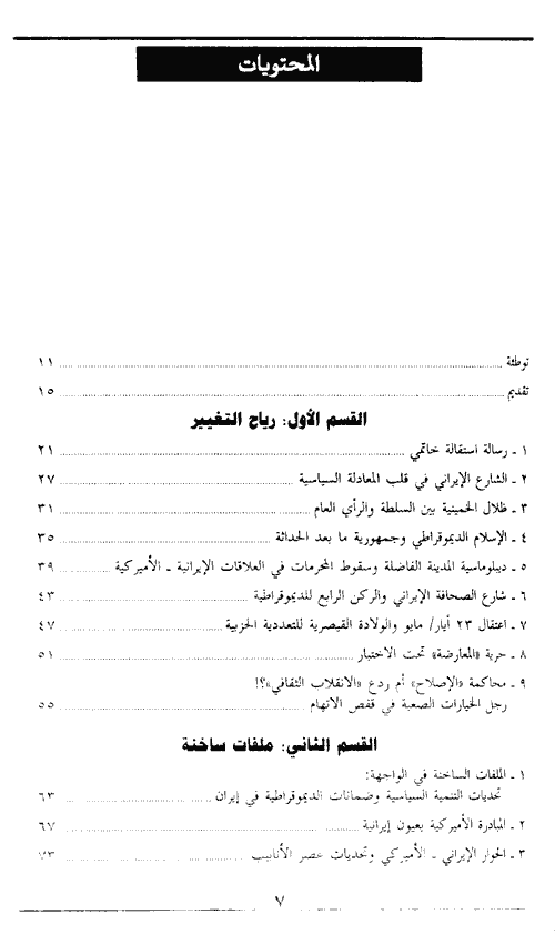 نبذة نيل وفرات:في محاولة تبدو وكأنها الأكثر جدلاً وحساسية وخطورة على مفترق خيارات الحركة-النهضة-الإسلامية والوطنية الإيرانية منذ العام (1906م، الثورة الدستورية) يتقدم الرئيس الإيراني محمد خاتمي، بخطى ثابتة وطيدة، لكنها بطيئة وهادئة عشية البدء بالألفية الميلادية الثالثة، على طريق إنجاز المصالح التاريخية المنشودة والمطلوبة منذ بدايات القرن العشرين بين الدين الإسلامي ...ونظام التعدديات السياسية الغربي، محاولاً بذلك ما يمكن تسميته مجازاً إرساء نظام الديموقراطية الإسلامية الراشدة.