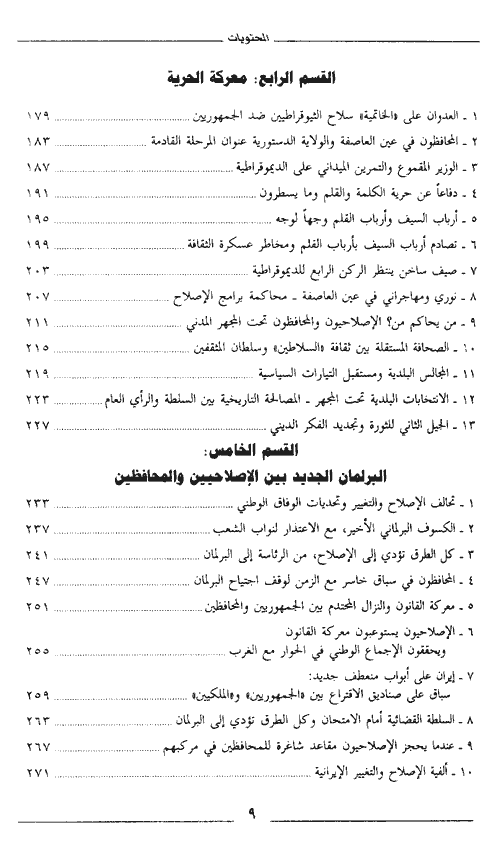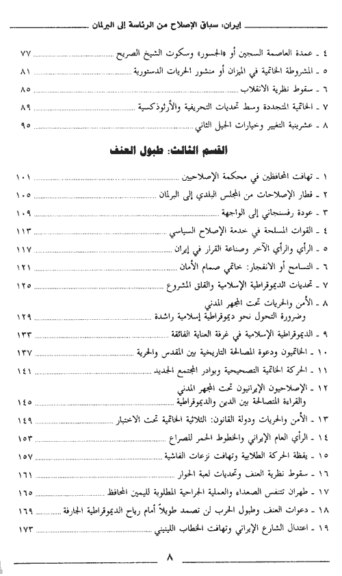 وفي هذا الكتاب يحاول المؤلف، تلمس الطريق الذي تسلكه الحركة الإصلاحية في إيران منذ تولي الرئيس محمد خاتمي سدة الرئاسة في إيران، وهي تحاول جاهدة إرساء قواعد اللعبة الديموقراطية على الطريق الإيرانية في فهم المصالحة بين الدين ونظام التعدديات السياسة الغربي؛ وصولاً إلى محطة البرلمان السادس في عمر الثورة والذي تسعى أن يكون المنبر القادر على الدفع باتجاه انتقال البلاد من النظام الرئاسي الحالي إلى نظام برلماني حزبي تعددي، يكون فيه الرئيس وتكون فيه الحكومة طيفاً من أطياف المجتمع المدني الإسلامي تأسياً بمدينة الرسول صلى الله عليه وسلم ورعيله الأول مع الأخذ بعين الاعتبار كل المستجدات التاريخية التي لا بد منها عند البحث عن التواصل. إقرأ المزيد