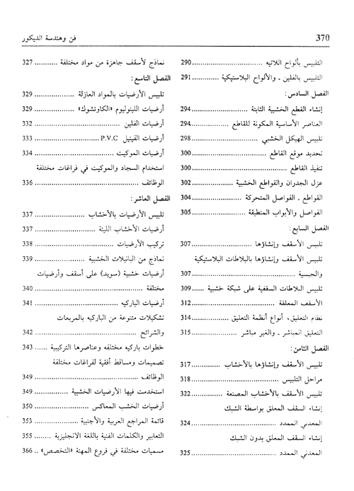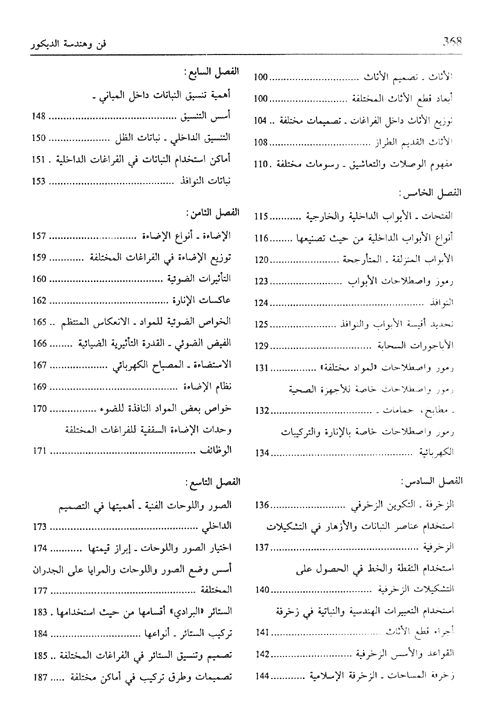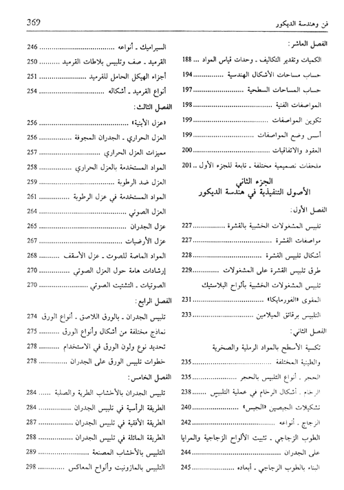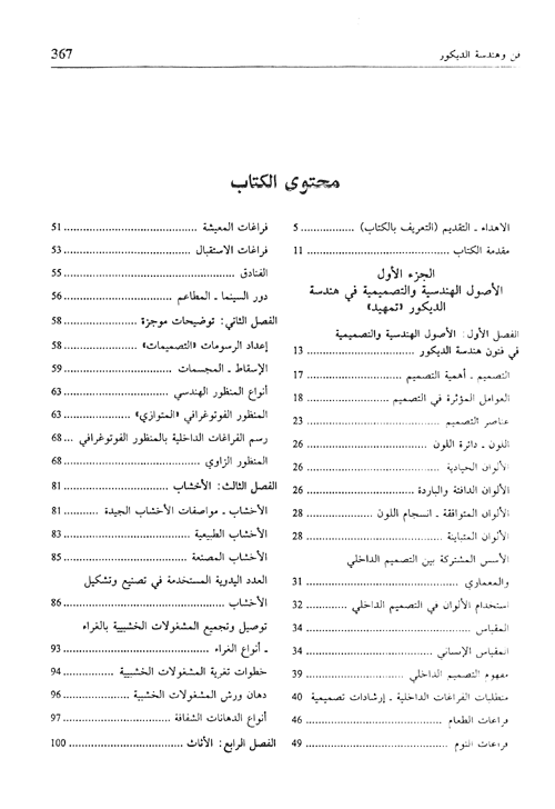 وهذا المؤلف يقدم عدداً من المواضيع الخاصة بتصميم وتنفيذ الديكور وذلك في جزءين، حيث يبحث الجزء الأول: الأصول التصميمية والهندسية والأمور الجمالية المختلفة في هندسة الديكور كتصميم الأثاث، الأبواب الداخلية والخارجية، التكوين الزخرفي، الصور واللوحات الفنية وأهميتها في التصميم.