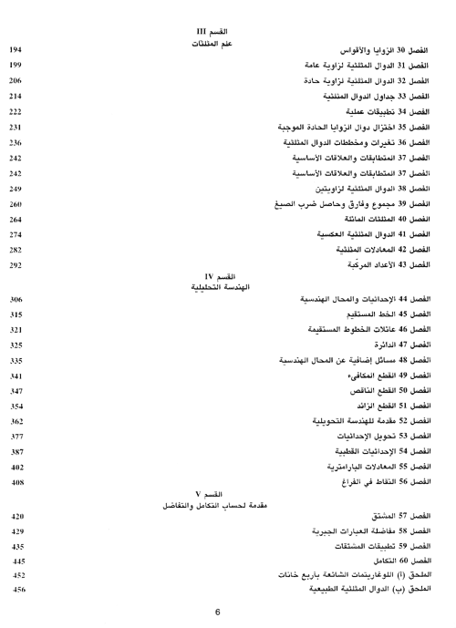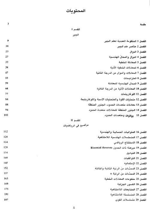وهو يغطي الموضوعات التالية: الجزء الأول الجبر، الجزء الثاني رياضيات الحاسوب، الجزء الثالث الهندسة التحليلية، الجزء الرابع مدخل إلى حساب التفاضل والتكامل. إقرأ المزيد