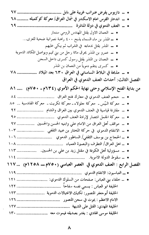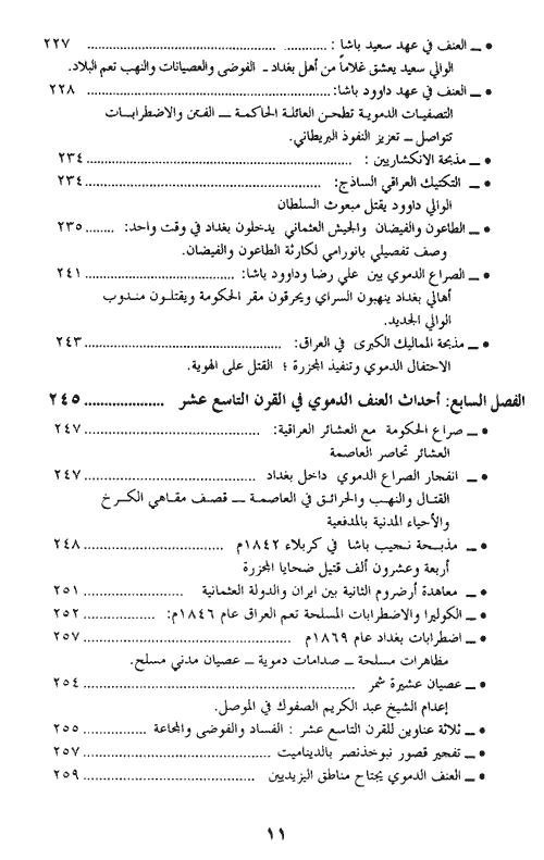 هذا وخلال استعراض المؤلف للوقائع والأحداث التاريخية لما جرى على أرض العراق والتي تدعم وجهة نظره في موضوع العنف الدموي فإنه لجأ للتوسع في سرد بعض الأحداث في التاريخ العراقي للتعريف بتلك الأحداث من جهة وللكشف عن بصمات العنف والقسوة الدموية البالغة من جهة أخرى.