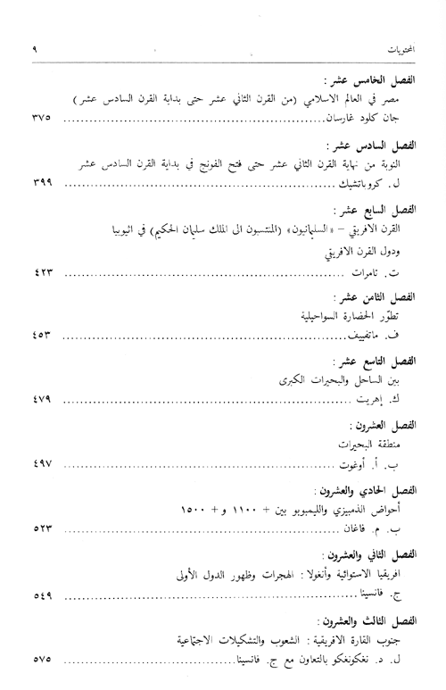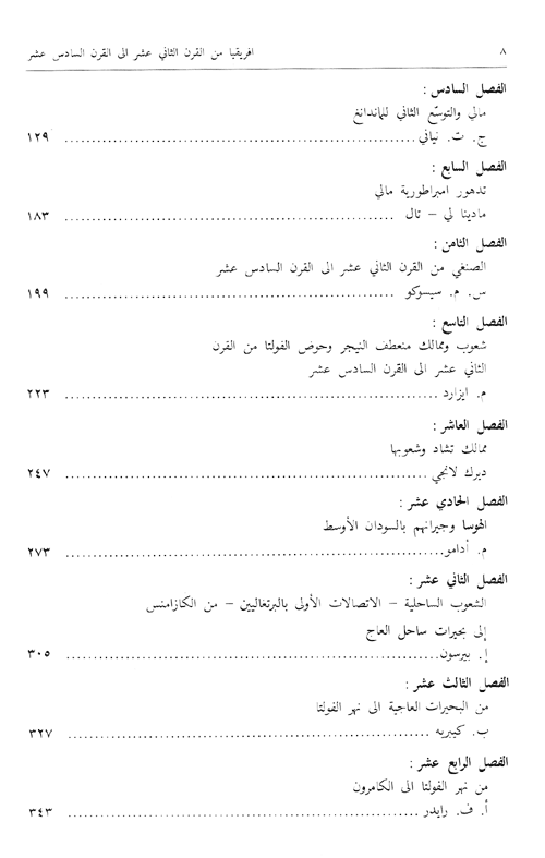 الفصل التاسع: شعوب وممالك منعطف النيجر وحوض الفولتا من القرن الثاني عشر إلى القرن السادس عشر، الفصل العاشر: ممالك تشاد وشعوبها، الفصل الحادي عشر: الهوسا وجيرانهم بالسودان الأوسط، الفصل الثاني عشر: الشعوب الساحلية من الكازامنس إلى بحيرات ساحل العاج، الفصل الثالث عشر: من البحيرات العاجية إلى نهر الفولتا، الفصل الرابع عشر: من نهر الفولتا إلى الكامرون، الفصل الخامس عشر: مصر في العالم الإسلامي، الفصل السادس عشر: أمنوبة من نهاية القرن الثاني عشر حتى فتح الفونج في بداية القرن السادس عشر، الفصل السابع عشر: القرن الإفريقي، الفصل الثامن عشر: تطور الحضارة السواحلية، الفصل التاسع عشر: بين الساحر والبحيرات الكبرى، الفصل العشرون: منطقة البحيرات، الفصل الحادي والعشرون: أحواض الذمبيزي والليمبوبو، الفصل الثاني والعشرون: إفريقيا الاستوائية وأنغولا، الفصل الثالث والعشرون: جنوب القارة الإفريقية الشعوب والتشكيلات الاجتماعية، الفصل الرابع والعشرون: مدغشقر والجزر المجاورة، الفصل الخامس والعشرون: العلاقات بين مختلف المناطق، الفصل السادس والعشرون: إفريقيا من خلال العلاقات بين القارات. وقد ألحق المؤلف كتابه بخاتمة عامة تضمنت خلاصة ما تطرق إليه الكتاب من الموضوعات. إقرأ المزيد