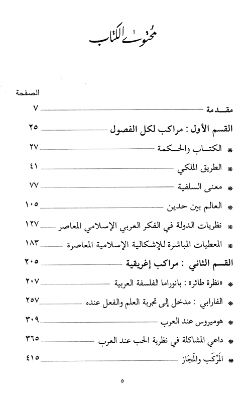 كما بحث هذا القسم في المنطلقات النظرية للتجربة الفكرية العربية في اتجاهها نحو التحديث والتحرر من سطوة الأسطورة والخرافة. أما القسم الثاني (مراكب إغريقية) فيبحث في انعكاسات انفتاح العقل العربي على علوم الأولين وهي علوم نافعة في بناء العالم وتشكيله علمياً ومادياً وإنسانياً. فلقد كانت حركة الترجمة والنقل خطوة جبارة قادت إلى الانفتاح على الكون والوجود.