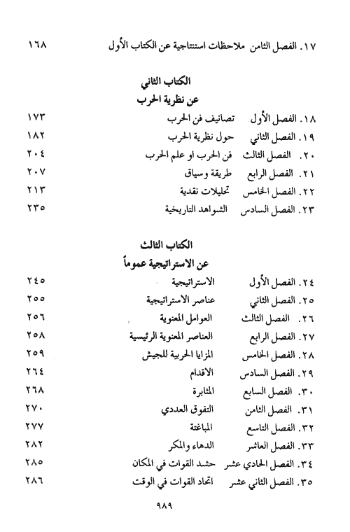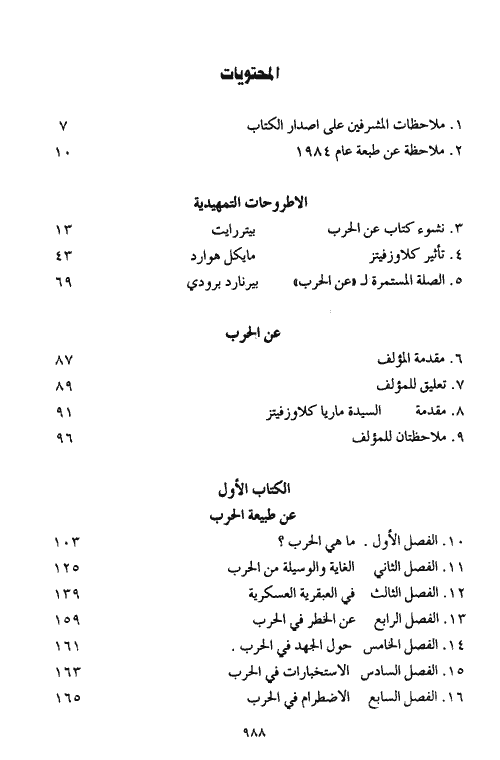 وسيجد قارئ هذا الكتاب نظرية متماسكة وأساسية في نظرية الصراع، كما سيفهم كيفية نشوئها يقع (عن الحرب)ى في ثماني كتب أو أقسام رئيسية، يقدم المؤلف في القسم الأول مقدمة شاملة حيث يحدد أهداف الحرب في ثلاث جمل متتالية هي في فرض رغبتنا على العدو لفصل ما. واستخدام الحد الأقصى من وسائل القوة المتيسرة، وتوخينا جعله دون حول ولا قوة حيث يبدو هنا التمييز بين الهدف العسكري والغاية السياسية كما يركز المؤلف أيضاً على الدور الذي تلعبه العاطفة في الحرب، ويناقش العوامل التي تعرقل وتقاطع الفعاليات في الحرب.